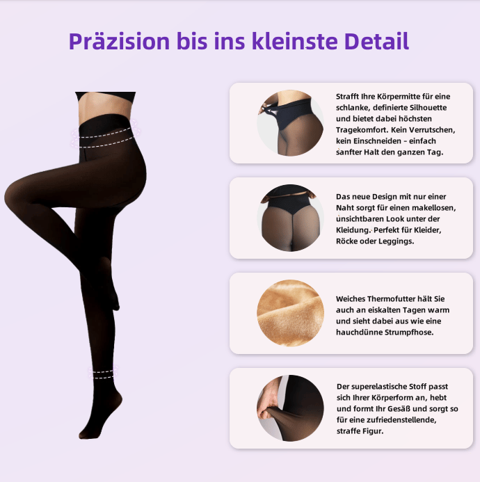 Mit ultraweichem Baby-Fleece gefüttert für gemütliche Wärme ohne Volumen. Der superelastische Stoff schmiegt sich natürlich an Ihre Beine, ermöglicht uneingeschränkte Bewegungsfreiheit und erzeugt einen makellosen Sheer-Effekt, der wie echte Haut aussieht.